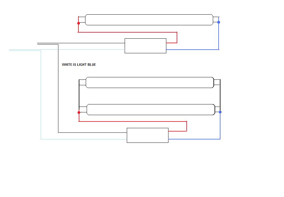 I have an older 8 ft. 3 tube(single pin) fluorescent light fixture with 2 ballasts, one ballast operates the two outside bulbs and one operates the middle bulb but only the middle bulb is working. Each ballast has a red and blue wire coming out from one side of the ballast close together and the other side has a black and white wire coming out close together. What I need is a wiring diagram showing how this light should be wired, if anybody knows how it should be wired could you please post a diagram for me....Thank You.