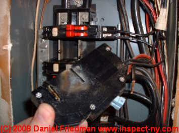 If you have the older Zinsco - Sylvania panelboxes the following picture shows a failure at the breaker location. It is advised that you change out your panel.