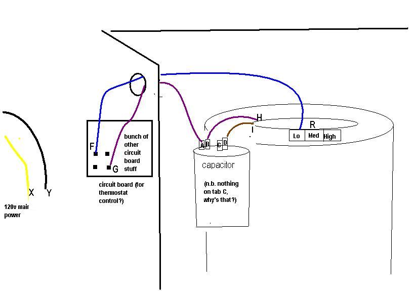 Went back down to look at things and decided that I had better not tinker more with something I so poorly understand (Capacitors etc.) (Curiosity + ignorance usually = trouble ) So, here are some photos that might shed some light for someone actually knowledgeable. I'll now read up on Capacitors but, if you look at the wiring "picture" (I wouldn't grace it with the label "diagram") I am wondering why there is only one input (Purple to A) to the capacitor but apparently two outs (Purple from B and Brown from D.) when I hardwired my electric leads (X,Y) yesterday, I (maybe foolishly) wired them to B and D. and that resulted in the fan running when I spun it. can you figure out anything from these photos and sketch.? Can anyone tell me how I can test that Capacitor? Or how I would wire it up to the live power to test the system with the capacitor IN but the circuit board Out.? Though on the other hand, I don’t want to do something boneheaded that might cost me a $300 fan. Peter Toronto, Canada