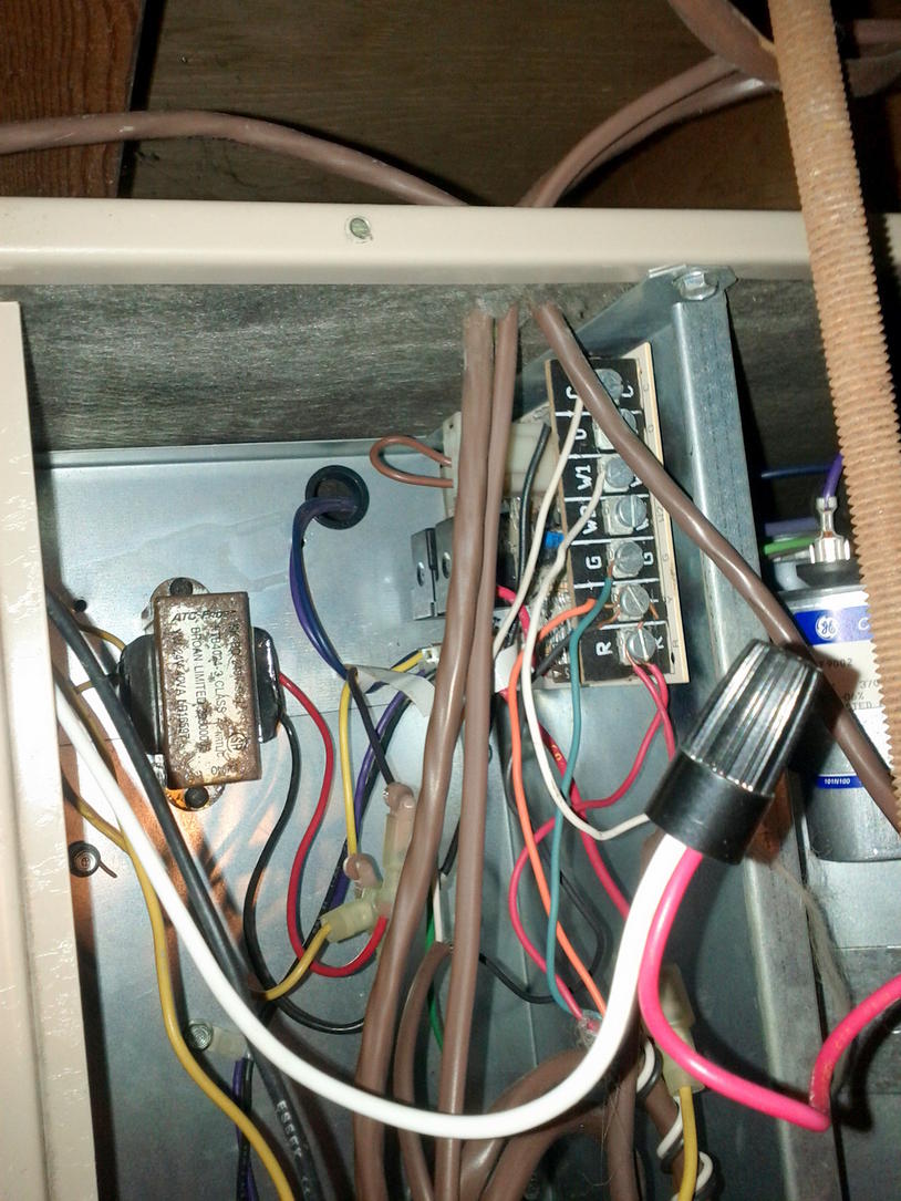 ok, looking at your photos, the brown goes into the motor, the larger purple goes into the motor, the small bright blue is 120 volt motor speed to the hi-lo-med connector block. the small bright purple looks to be the neutral. the two designations you give F & G are on the motor board. I'm gonna try to find this motor from what I see. the numbers I see are XSS 31 WMV - I'll check out grainger replacement motors first then go to my HVAC blower motors. thermostat connections are usually marked TH-TH on a control board. Motors have T1 & T2 for connections. Line input are L1 & L2.