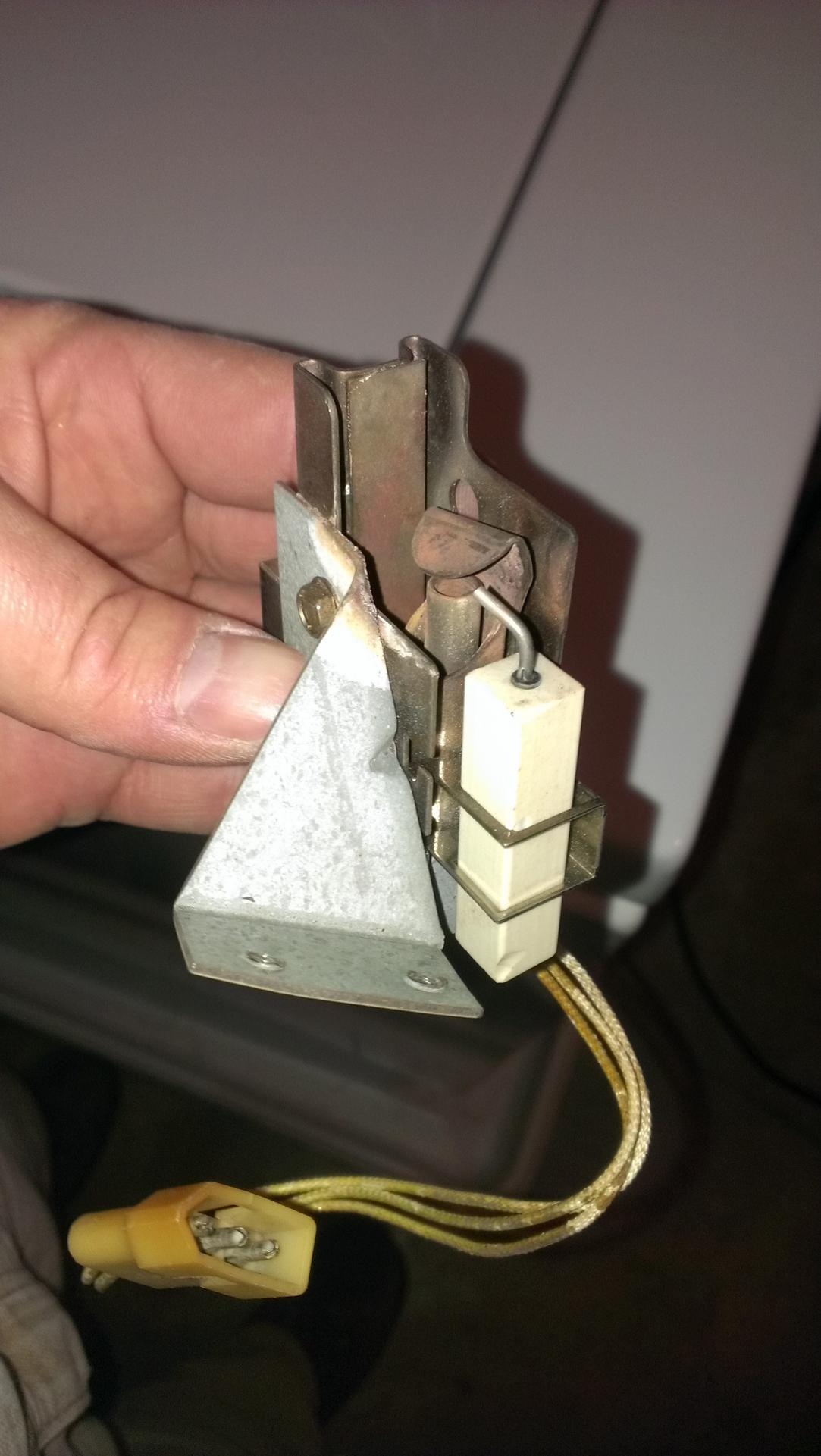 The orange wire broke away from the spark electrode when I removed the assembly. I will try to figure out how to attach it to the end with the screw inside the white plastic. Also, I removed the connector to be able to twist the ignitor burner away from its gas supply line. There is a flame sensor on the assembly? What does the insulated flame sensor look like? The silver gas line attaches to the middle part and the spark electrode encased in the white, square and about two-inch long plastic piece is attached to the pilot burner, but I don't understand what part the flame sensor is. Please describe it. I thought the flame sensor has a thin, metal projection like the spark electrode does. Thank you for continued, helpful responses.