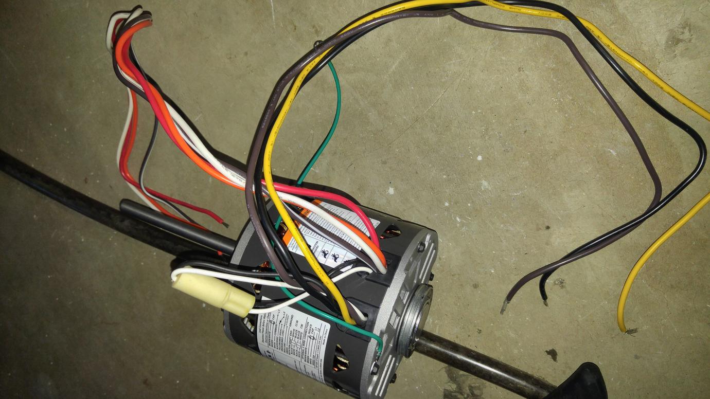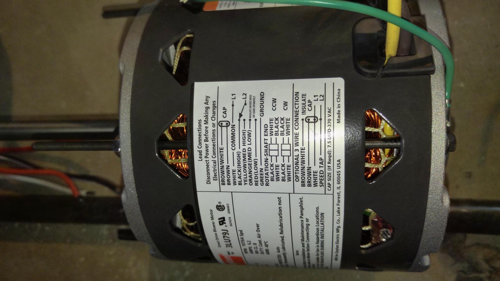 Now on the back of the Dayton motor, I have 2 Brown lines (1 w/ white strip and 1 without), White, Black, Yellow, Red and Orange. Also, 1 green which appears to be a ground only.