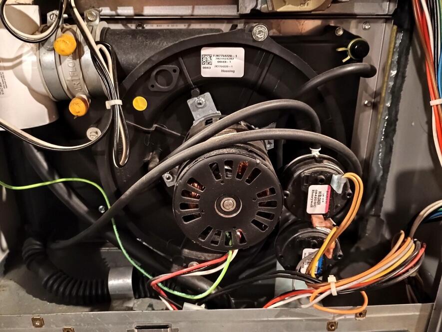 I'd also like to test the inducer motor's capacitor. I watched this guy's YouTube video to learn how to test the capacitor, but his furnace setup looks different than mine. I'm unable to locate it. The only two components branching off of the wiring harness from the inducer motor both look like pressure switches. So, I'm not sure which component is the capacitor.