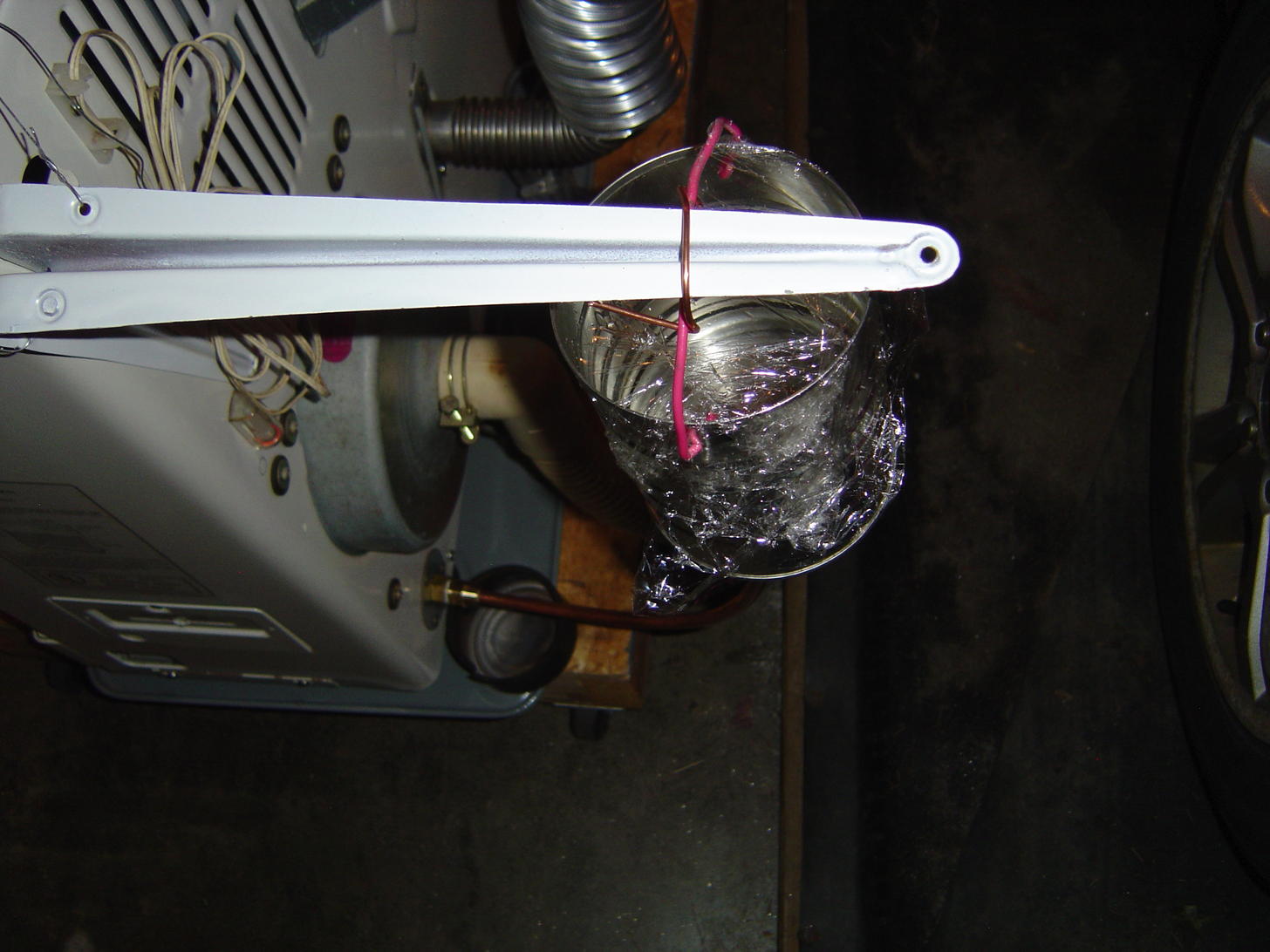 I ran the telephone wire through the tubing and put the drill bit into the opening in the combustion pot with no problem. No apparent obstructions.