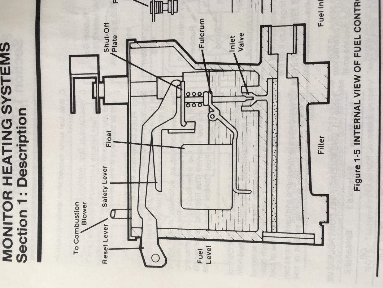 The reset lever in the picture resets the float by pushing the that tang on the float down. The reset lever end on mine goes all the way to the bottom of the chamber about 3-4 inches and rests on the chamber floor. On the bottom of that lever gets captured by the U clip I mentioned above. Evidently there were at least two types of level foot. One had a hole so strung onto the U clip. The other has a U cutout and the U slipped onto the U clip. The pictured unit does not have a U clip and the lever no elongated foot. If the picture is of a Monitor 40 level valve then there are at least three variations.