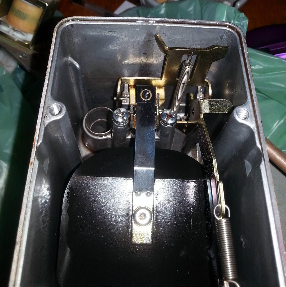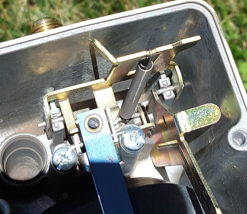 In the pictures you can see the U clip with the peened over ends of the standoffs. The clip runs from a standoff down to the bottom of the sump then up to the other standoff. The clip holds the spring bottom and the foot of the reset lever. The reset lever pushes against the plate with the top of the spring attached. The plate is also captured buy the arms of the U clip.