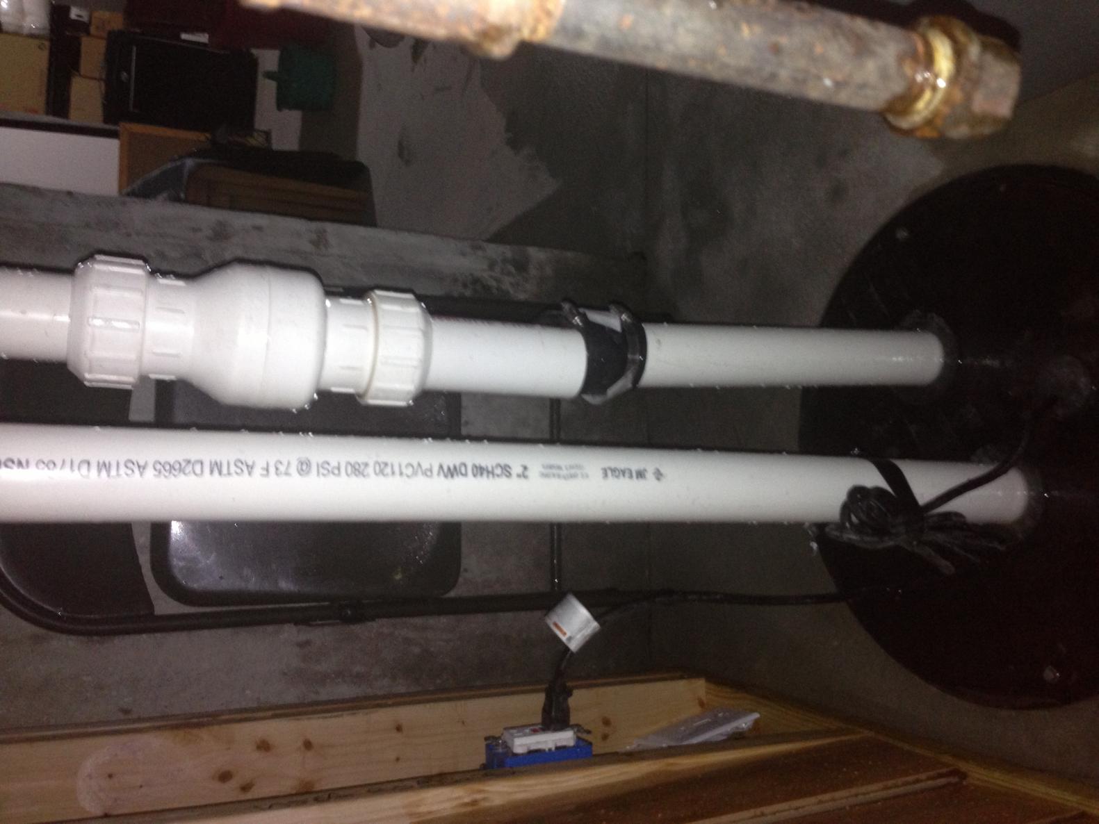Is the above installation done correctly? The PVC pipe that comes out of my ejector pump is cut at about a foot out and then held together by a rubber piece and two clamps. My neighbor has the same installation except that his pipe is a solid pipe without the cut until it reaches the threaded connector. I had a sewage backup when the piece that is connected by the clamps came undone. My plumber says that something heavy must have fallen against the pipe which caused it to shift, but the pump is in a utility room with nothing there that could have fallen against it. I'm not sure if my plumber is licensed and that's why I want to know if this installation was done correctly.Tags: None