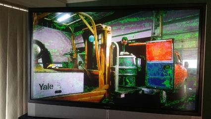 i recently got this for cheap, but it has these colours on the screen. the guy i got it from said it needs a new colour wheel. but i dunno. dispite the strange colours, the picture is fantastic, sharp and blacks are blacks and whites are bright white. (except when there green or pink hahaha)