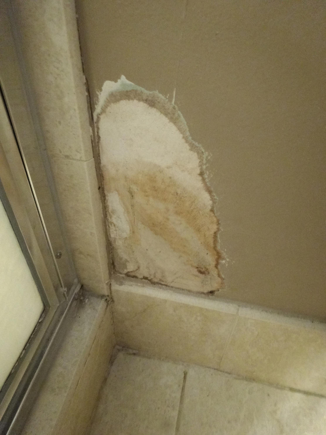 You're correct - the shower stall is all tile, no fiberglass. Here's a wider shot. As you can see, the bad spot is to the right of the shower stall. But the shower stall seems to be watertight...after a shower there's no water in that area. That's why it seems weird that there was moisture damage in that area...I still can't figure out where it came from. It was never dripping wet there...just the damp paper that I scraped off, and now a slight dampness in the darker part of the scraped area.