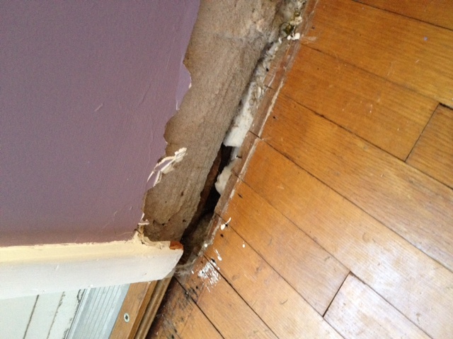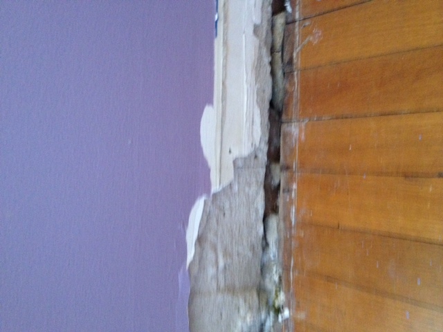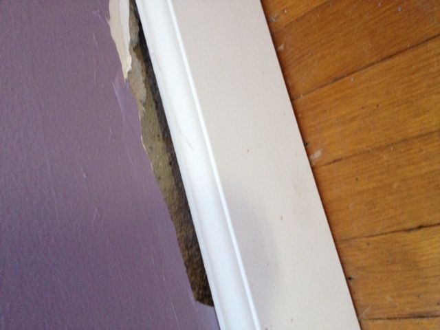 looks to me like the drywall was installed just even with the top of the baseboard instead of run almost to the floor level.