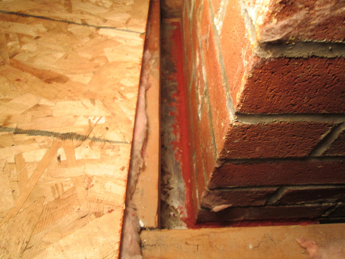 Now up in the chimney, The rafters go around the chimney, but has a 1-11/2 inch space around the chimney, ..some (half around) has the metal flashing against the chimney, that I sealed. But, the other section, just goes all the way to the cellar.