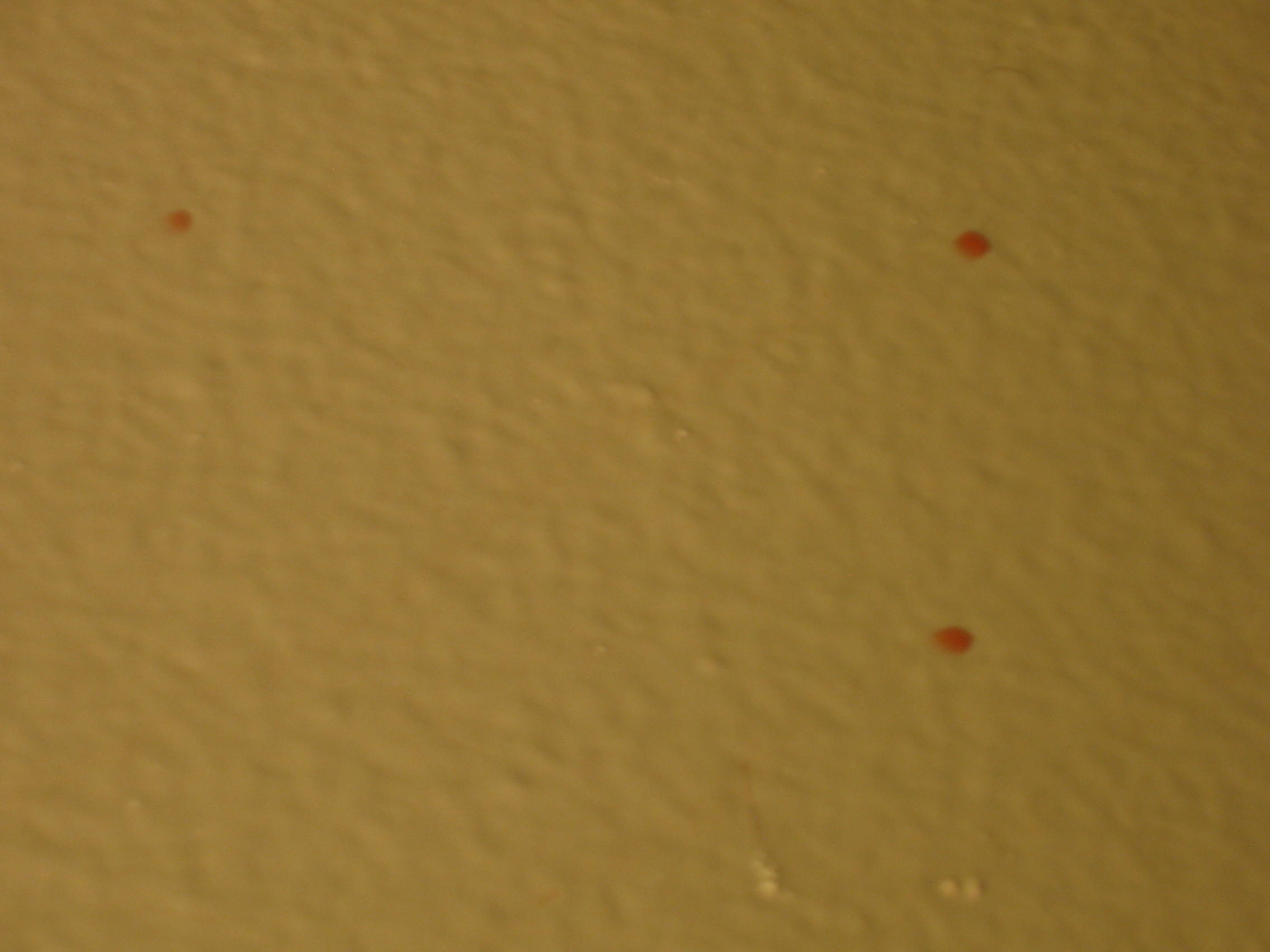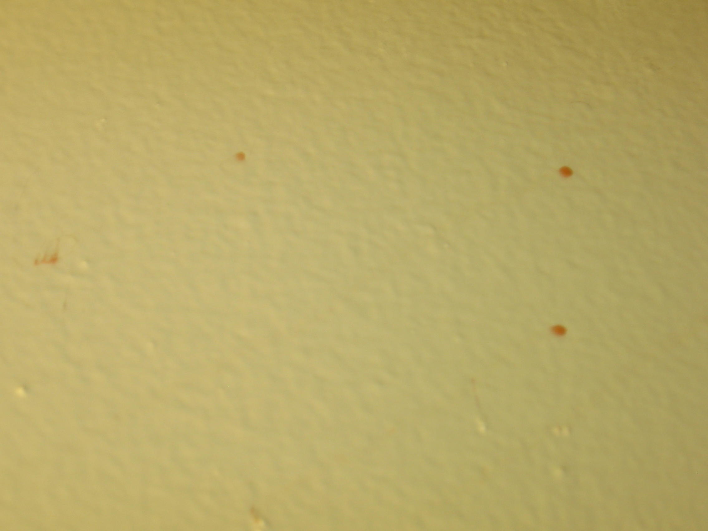several spaces on several walls have these. Never seen them before. Clean them off and a few weeks later they might return, in the same area or a different place on the wall. Always 4 to 10 or so spots in each small area. One or two areas like pictured on each wall. Not every wall every time that I look, but anywhere from zero to 2 or 3 areas like pictured have these. Even cleaned all the walls with bleach. Still they come back.